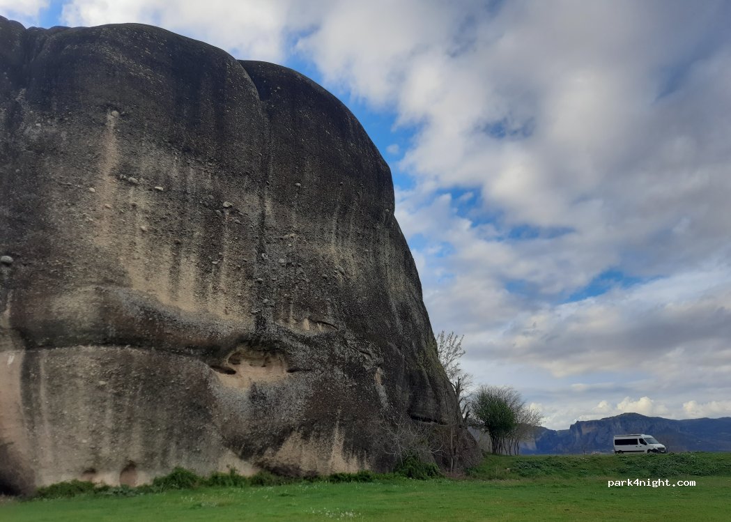 Wspaniałe miejsce na nocleg, bardzo spokojna okolica, duża polana obok meteora. We wsi super tawerna. W pobliżu kran z wodą i kubeł na śmieci. Za meteorem most z 16 wieku i koryto jednej z największych rzek w Grecji.