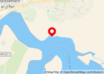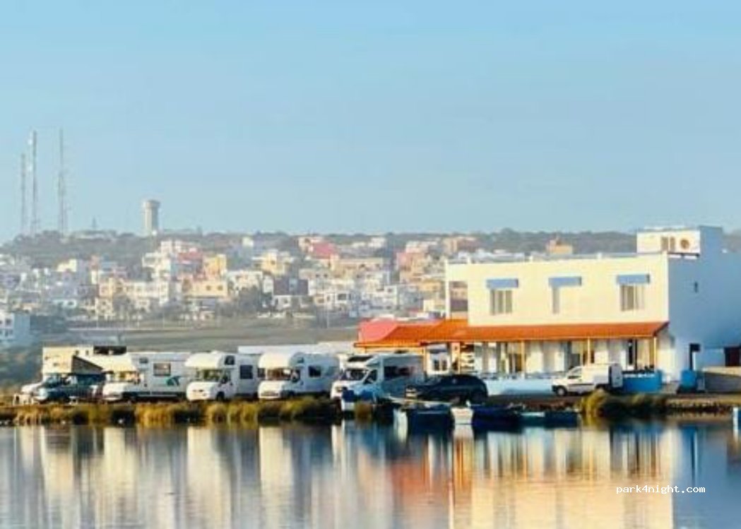 Parking at the shore of a lake at a hotel with dirt / gravel parking lot. Lovely view of fishing boats and wading birds. Very friendly place, welcoming, helpful staff. Access to toilet/shower. Coffee/food available in the restaurant. Chicken tagine 80Mad. 100Mad per night without electricity (available). Quiet night with only the distant barking of dogs. Nice stopover!