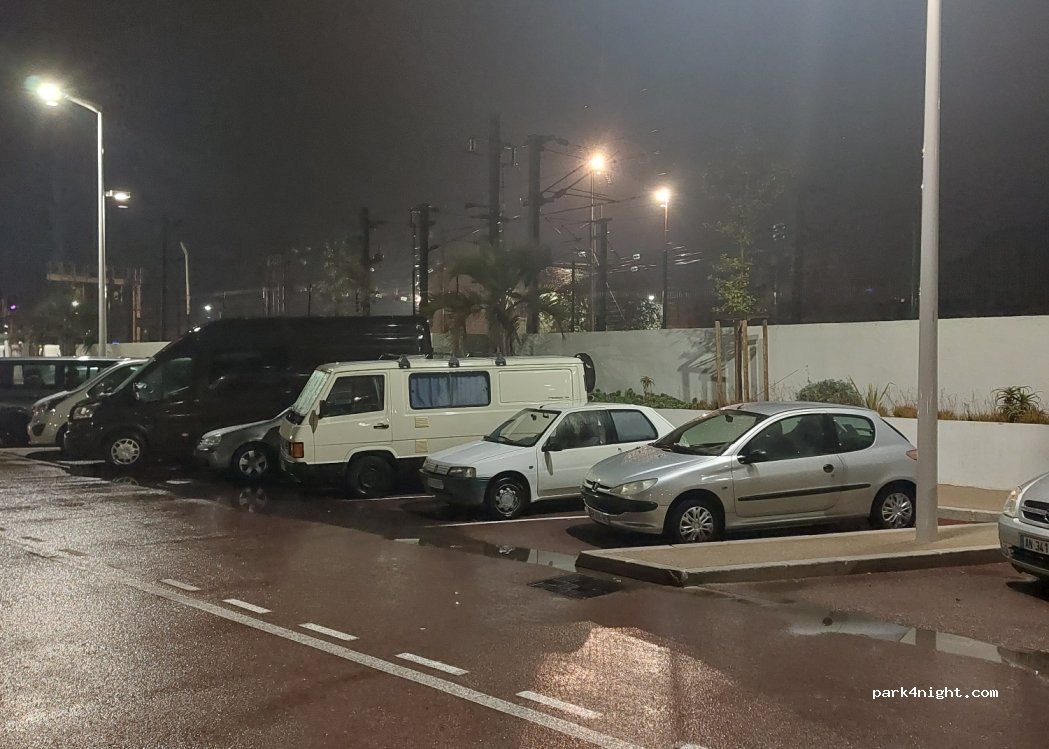 Parking gratuito frente al mar. Mucho Parking en invierno y poco en verano. Bien iluminado y tranquilo. A 40 minutos caminando del centro de Cannes. También pasa un tren cerca. Hay un baño público cerca. Por la noche no hay sitio, pero so llegas por la tarde seguro que encuentras. También hay para cargar coches eléctricos. La ducha se encuentra en la playa.