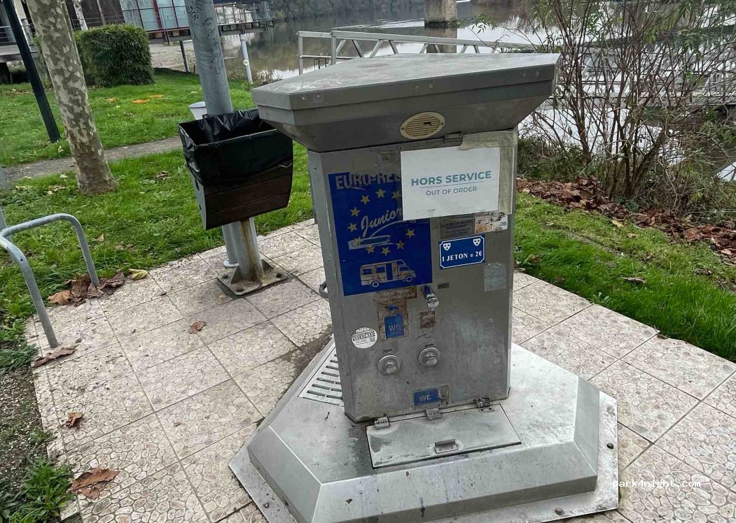 Aire de services pour camping car. Euro-Relais token based unit - but out of order on 7 Dec 2023. Can dump black and grey water but cannot fill with water or charge electricity