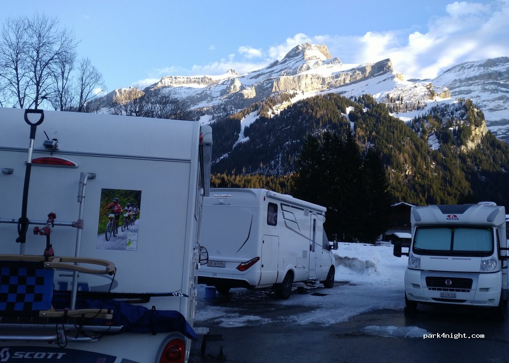 magnifique village suisse, bel espace pour les Van et CC. Si besoin des toilettes avec eau chaude au télécabine un peu plus haut. Top place !