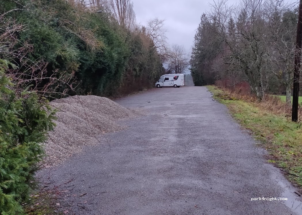Simple Parking, route en face de l' aire de camping- car, Indiqué par le panneau ayant un P. Sur goudron. Éloigné de la route de 100m. Faux plat mais pas gênant.
