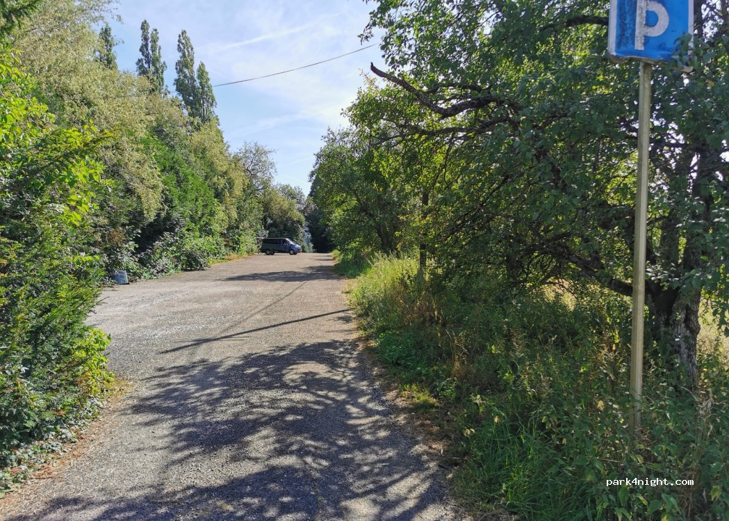 Einfaches Parken, Straße vor dem Wohnmobilstellplatz, gekennzeichnet durch ein P-Schild. Auf Asphalt. 100m von der Straße entfernt.