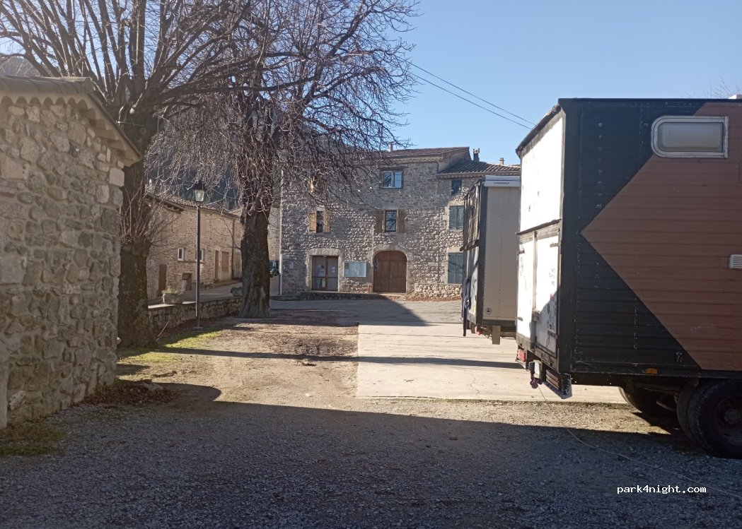 Parking pour 5/6 véhicules. Véhicule long sans soucis. Terrain plat. Électricité mis a disposition par le village. Toilette public. Situé à quelques mètres de l'épicerie, bar tabac, et poste.