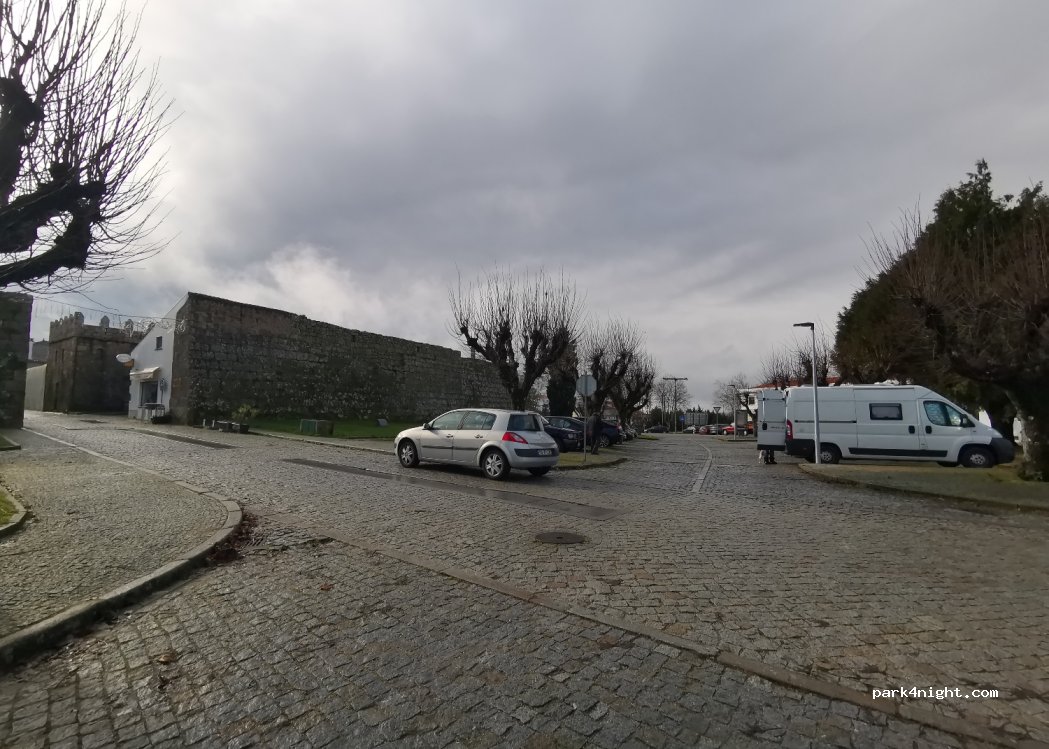 Parking lot in front of the door to enter the village. One of the doors, not the main.