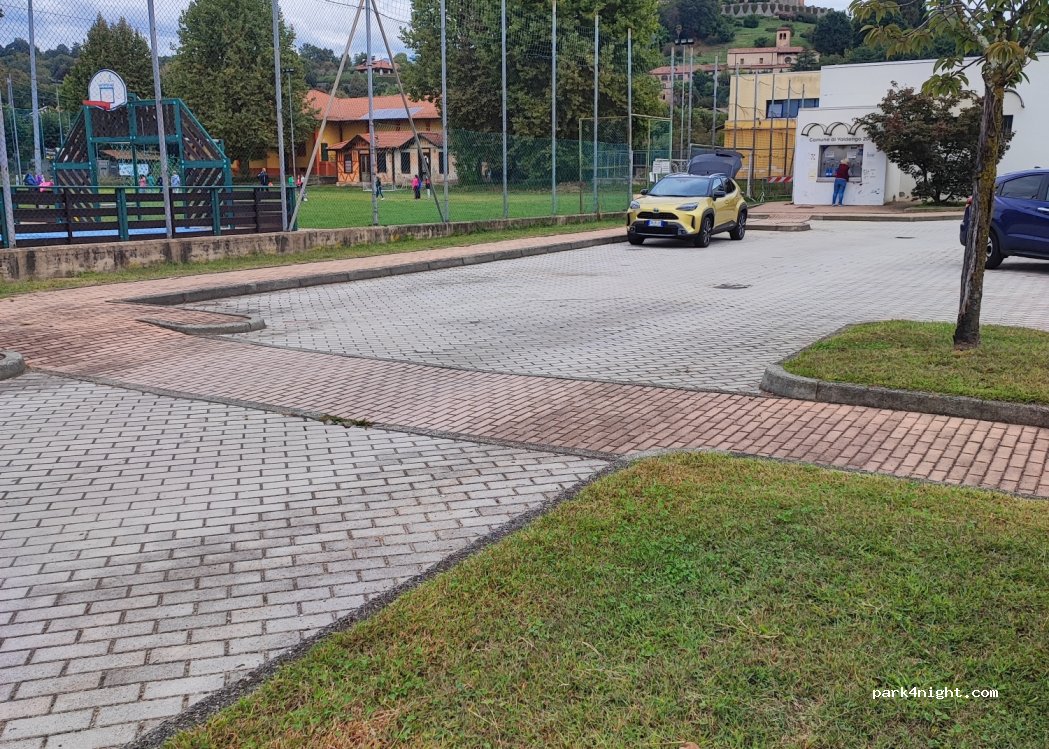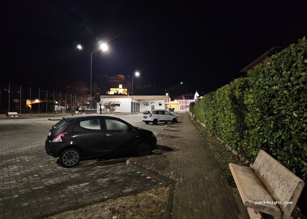 Öffentlicher Platz mit Parkplatz für Autos und Wohnmobile.