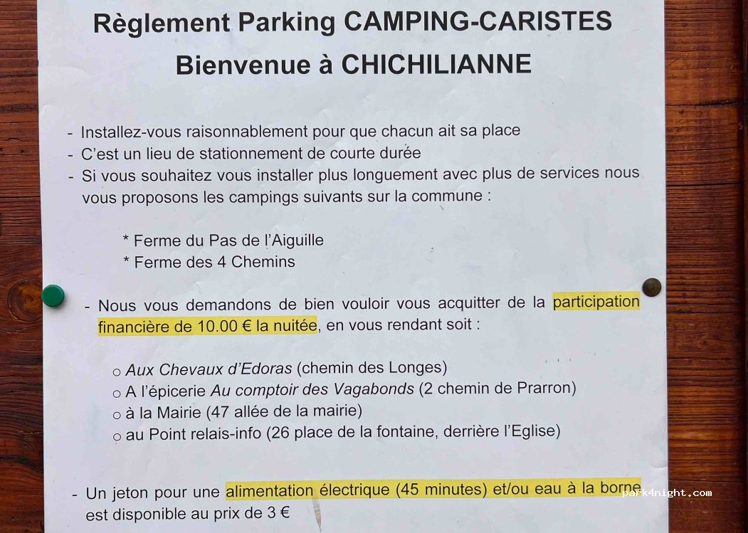 • Super endroit très calme. À 4 km de la D1075. Les jetons pour la borne sont à retirer chez les commerçants (s'ils en ont !)