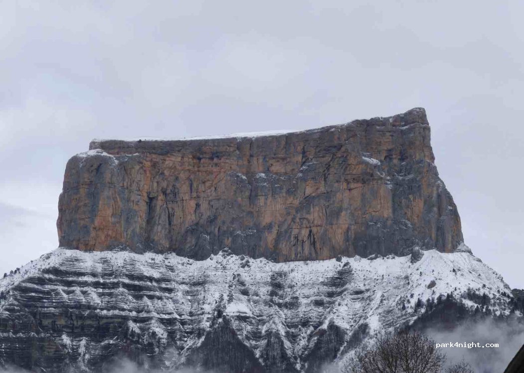 Nous avons passé une nuit au calme. Prévoir les cales car un peu en pente. Vue splendide sur le mont Aiguille qui s’est revêtu d’une couche de neige durant la nuit. Pas de services à cette période.
