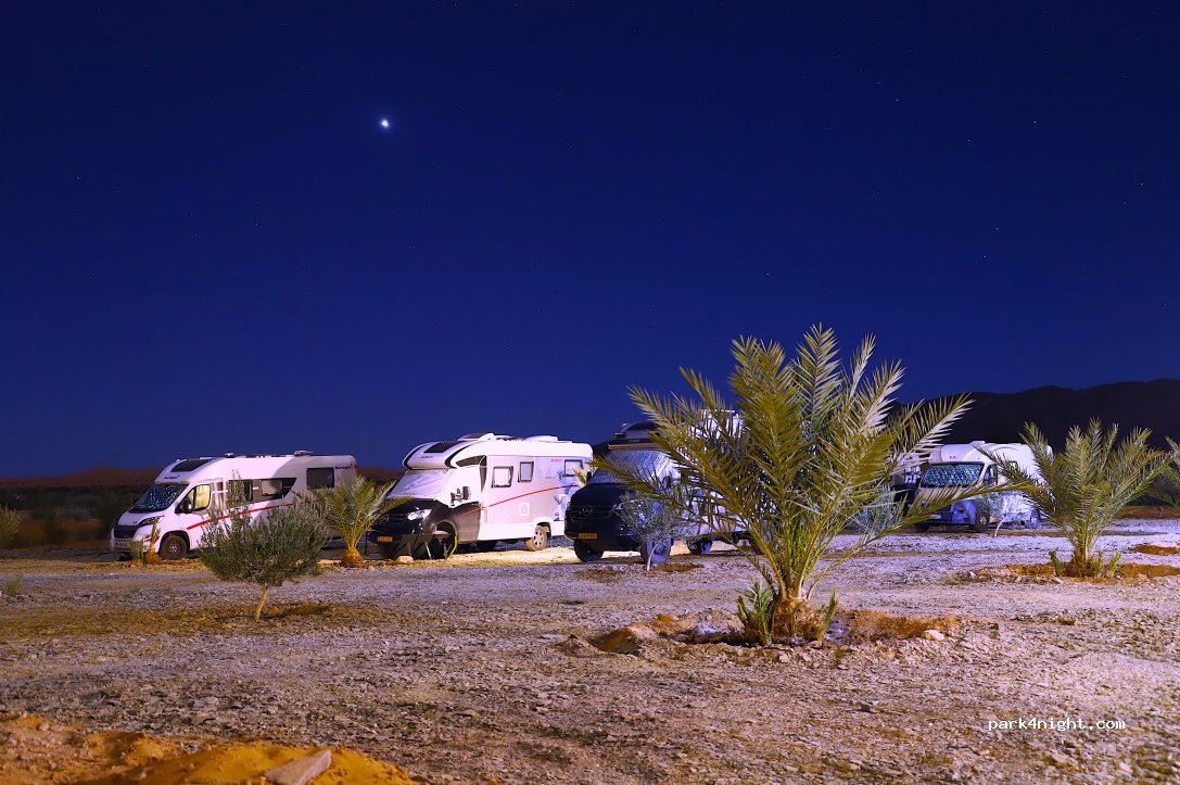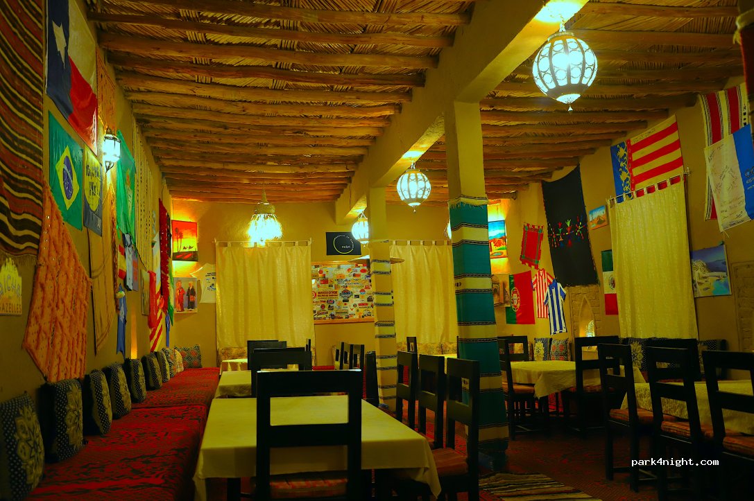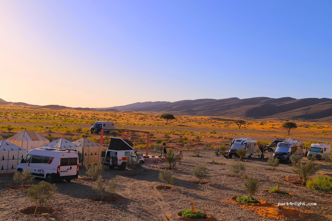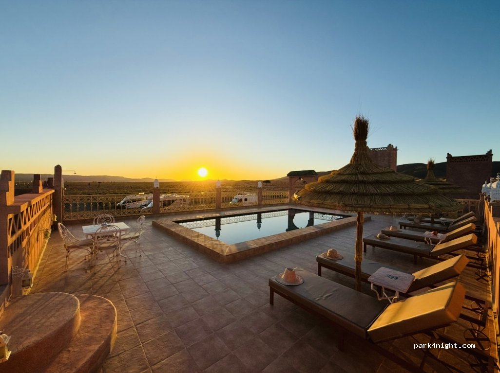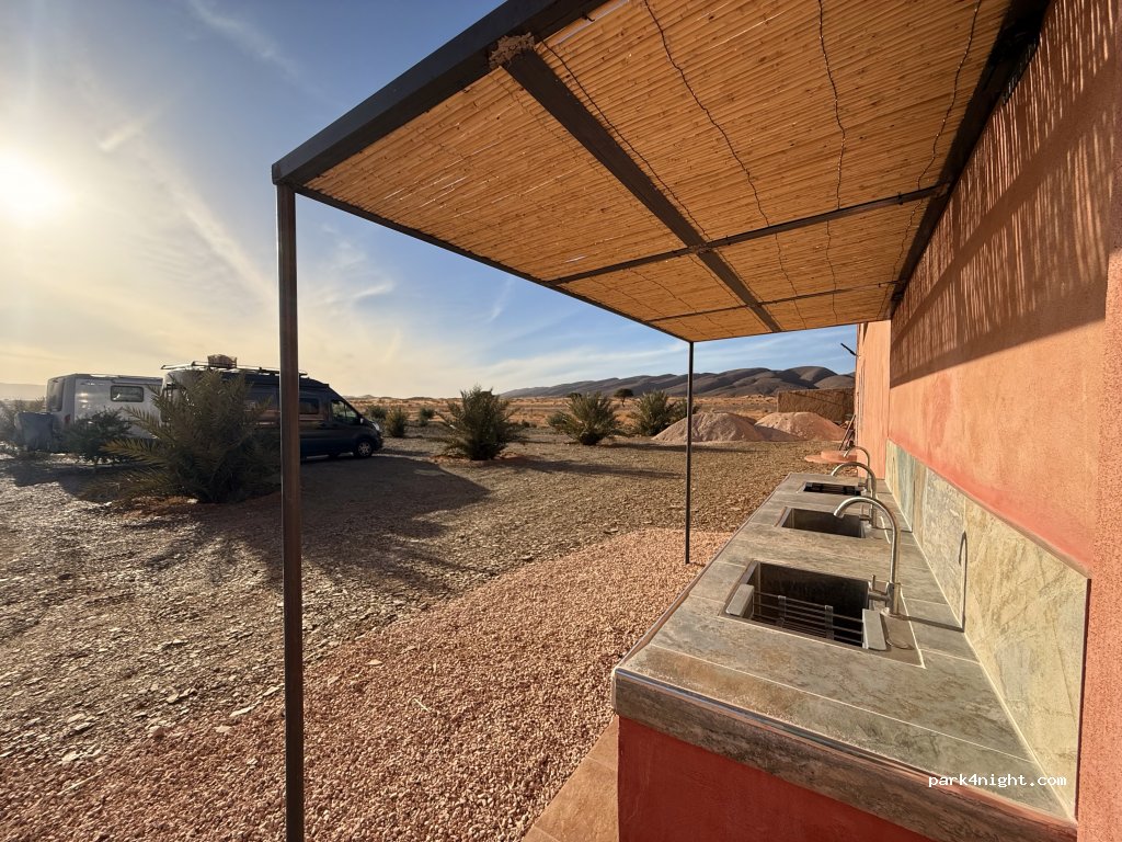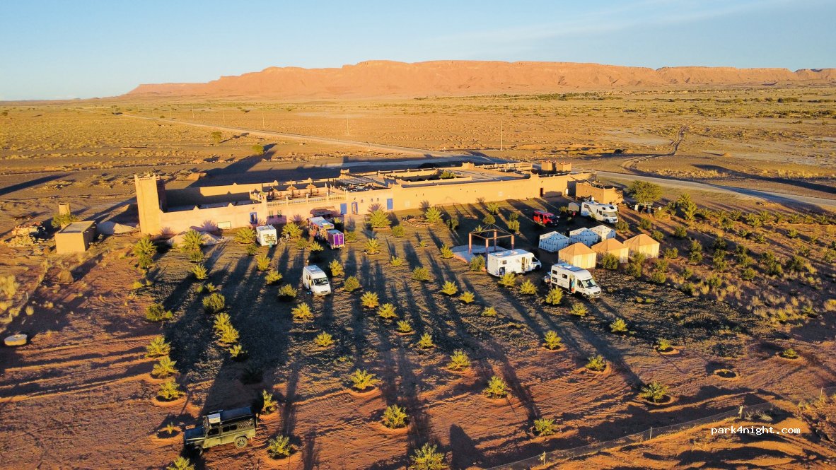 Der Stellplatz ist sandig. Ganz neue Sanitäranlagen und ein schöner Pool auf dem Dach. Freundliches und hilfsbereites Personal. Gemütliches Restaurant mit Dinner und Frühstück. Sehr empfehlenswerter Startpunkt für Ausflüge in die Wüste. Wird gern von Campern angefahren, die die Tour nach Zagora oder Mhamid planen