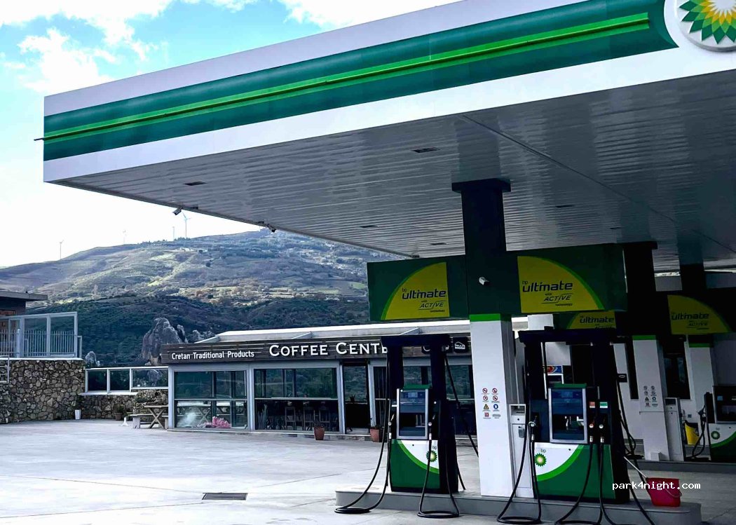 Station service avec parking. Possibilité d'échanger des bouteilles de gaz et de prendre de l'eau. Très propre. Personnel sympa. Ils n'ont rien contre le fait de passer la nuit... mais ce n'est pas agréable dans la rue...