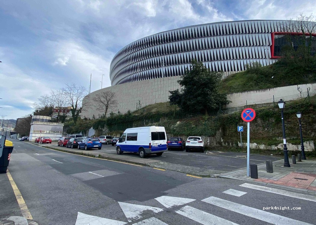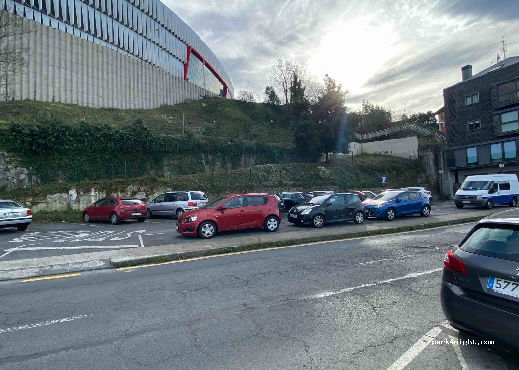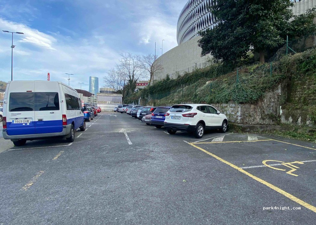 Pequeño aparcamiento bajo el estadio San Mamés. Más probabilidad de encontrar sitio de noche. Área tranquila para pernoctar. Perfecto para visitar el centro de Bilbao. Desde el 1 julio de 2024 es de estacionamiento regulado, hay que pagar y de día solo puede estacionarse 5h