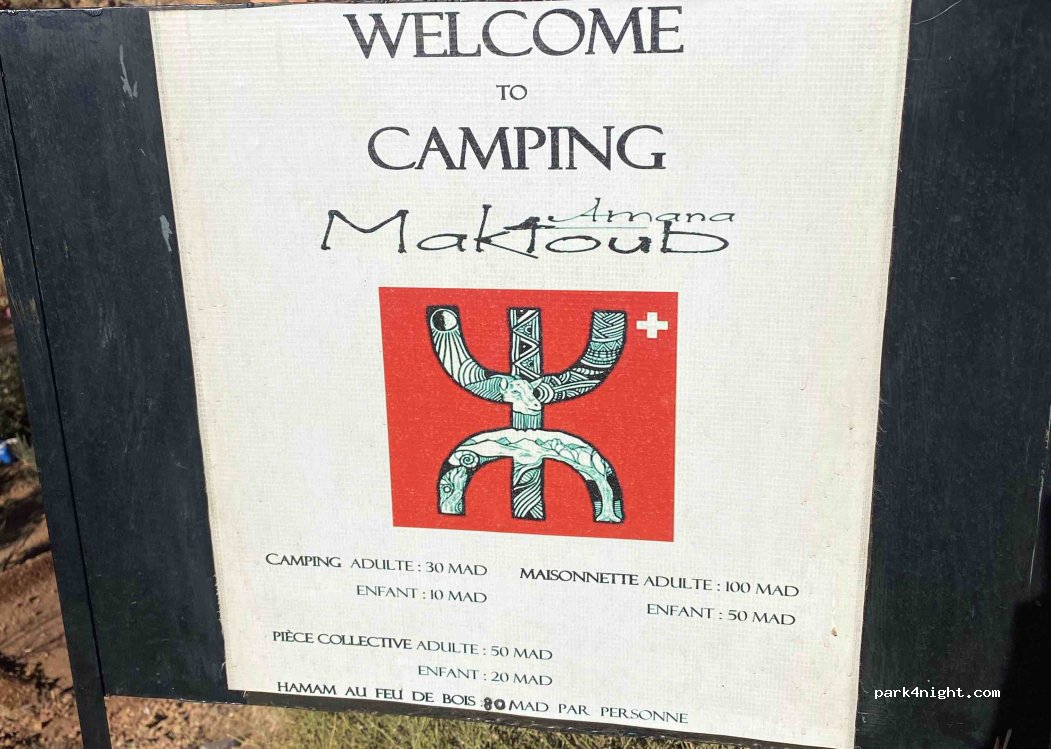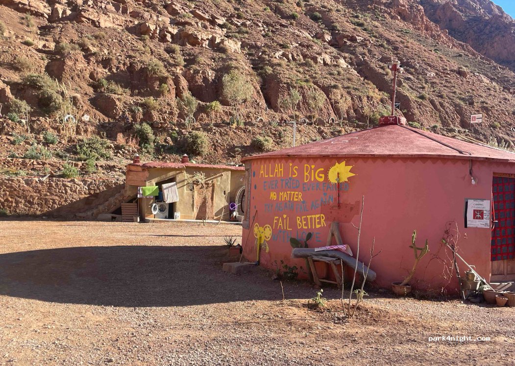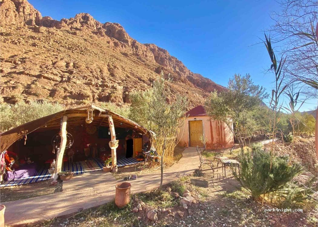 très bon camping accueillant avec WiFi environ 4 places camping car, un resto juste à côté propose des pizzas berbères excellentes petit Hamman sans prétention ou l'on doit attendre 1h30 à 2h pour qu'ils le préparent personnellement je recommande