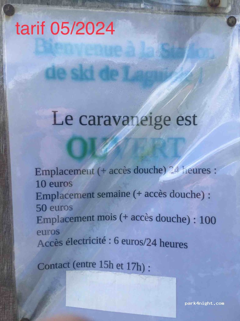 Ample parking at the foot of the slopes. Caravaneige pitches. Very quiet, free shower and toilet. Electricity on request to the manager (at restaurant), free. No emptying possible.