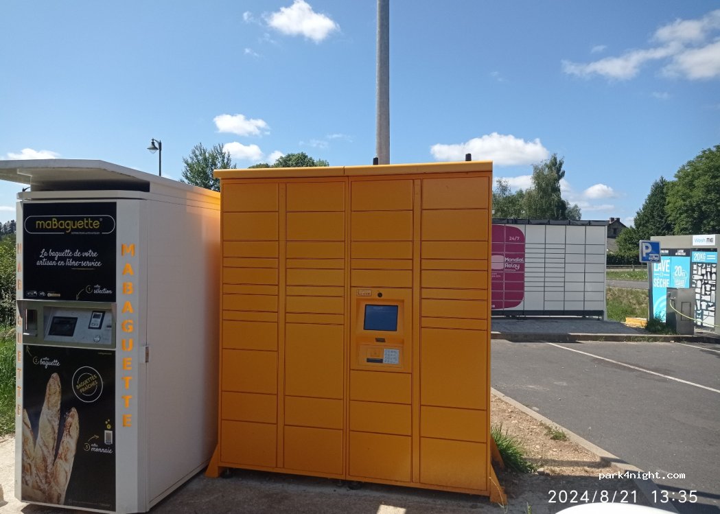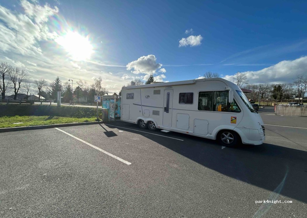 Angenehmer Aufenthalt. Mit Postabholstelle, Amazon-Abholstelle, Baguettautomat, Waschsalon und Tankstelle direkt vor Intermarché (mit Toilette). Strom (normale Steckdosen 230V) und Wasser ist kostenlos, je zwei Zugänge, zwei große Tische mit Bänken und große Mülleimer. Abends schließt das Geschäft um 19 Uhr, die Nächte sind ruhig. Ab und an kommt die Gendarmerie und holt sich ein Baguette…