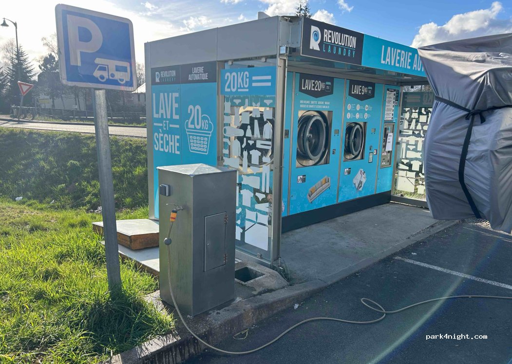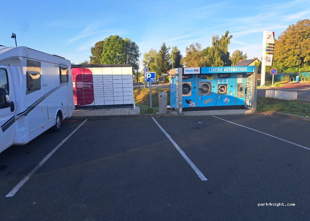 Emplacement sur le parking d’Intermarché, service électricité et eau gratuits. Laverie sur place. Seul bémol, les places sont devant les lockers à colis, donc beaucoup de passage.