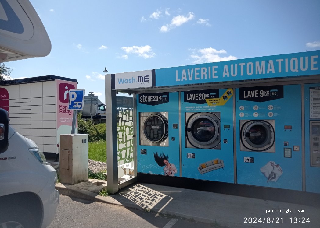 pratique et calme la nuit, mais nous nous sommes garés de l'autre côté du parking car les places cc sont juste devant la laverie et les boxes de retrait Amazon donc nous avions peur d'être dérangés tôt le matin.