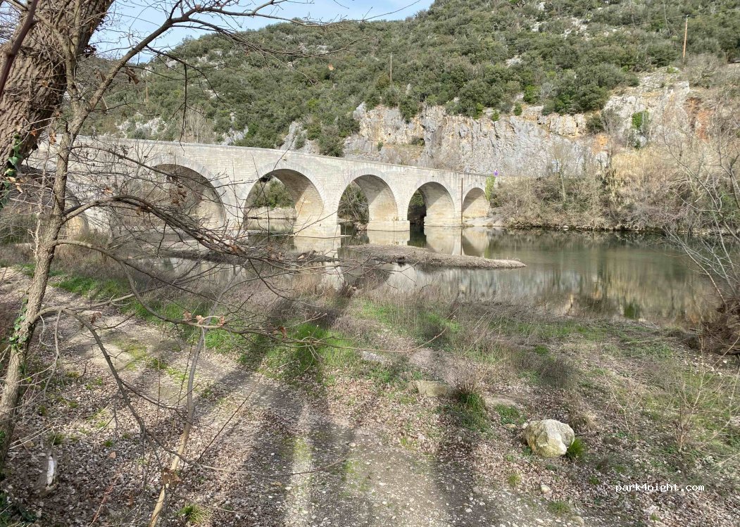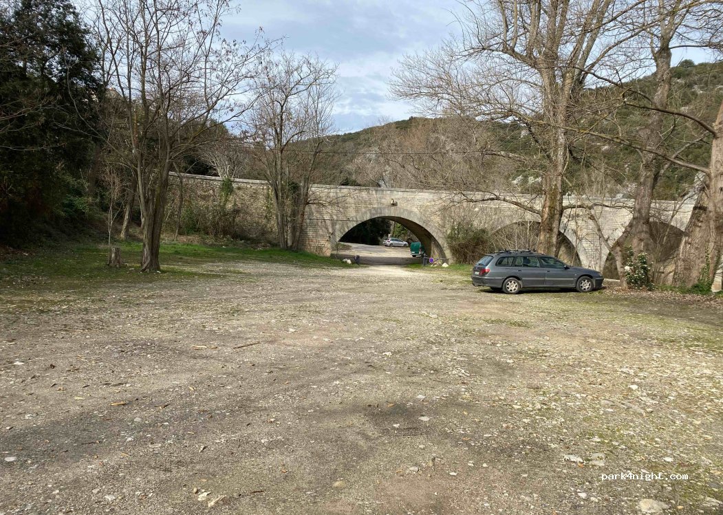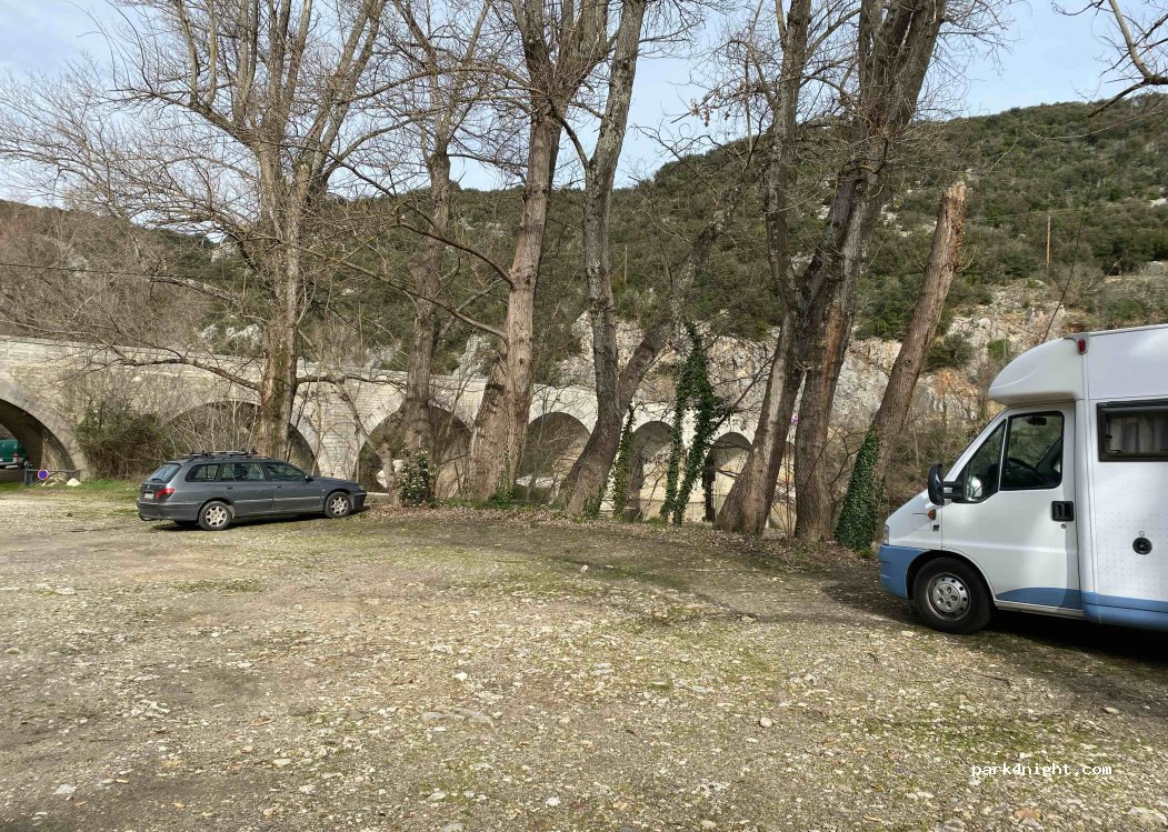lovely park up next to the pretty river and arches, lots of spaces and close to the beautiful village of Montclus which is definitely worth visiting