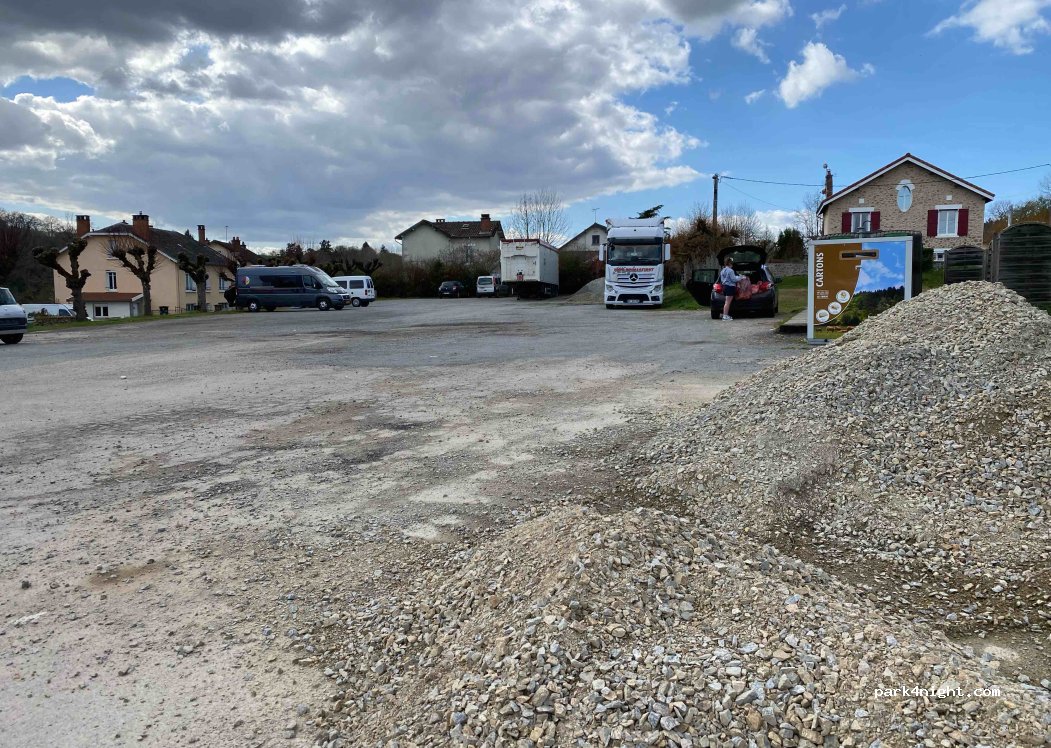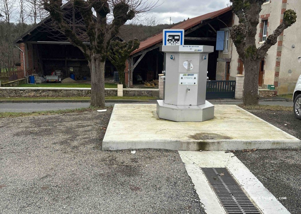Très Grand parking avec Borne de service, eaux noires, eaux usées, eau potable, 2 prises elec, poubelles. Borne qui fonctionne avec des jetons à prendre à la mairie ou au bureau de tabac. 3€ le jeton de 10min. Boulangerie, pharmacie, Petite supérette et gare (train pour visiter Limoges) à proximité.