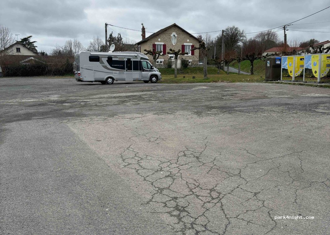 Very large parking lot with service point, black water, waste water, drinking water, 2 electrical outlets, trash cans. Terminal that works with tokens to be taken from the town hall or tobacco shop. €3 per 10min token. Bakery, pharmacy, small supermarket and train station (train to visit Limoges) nearby.