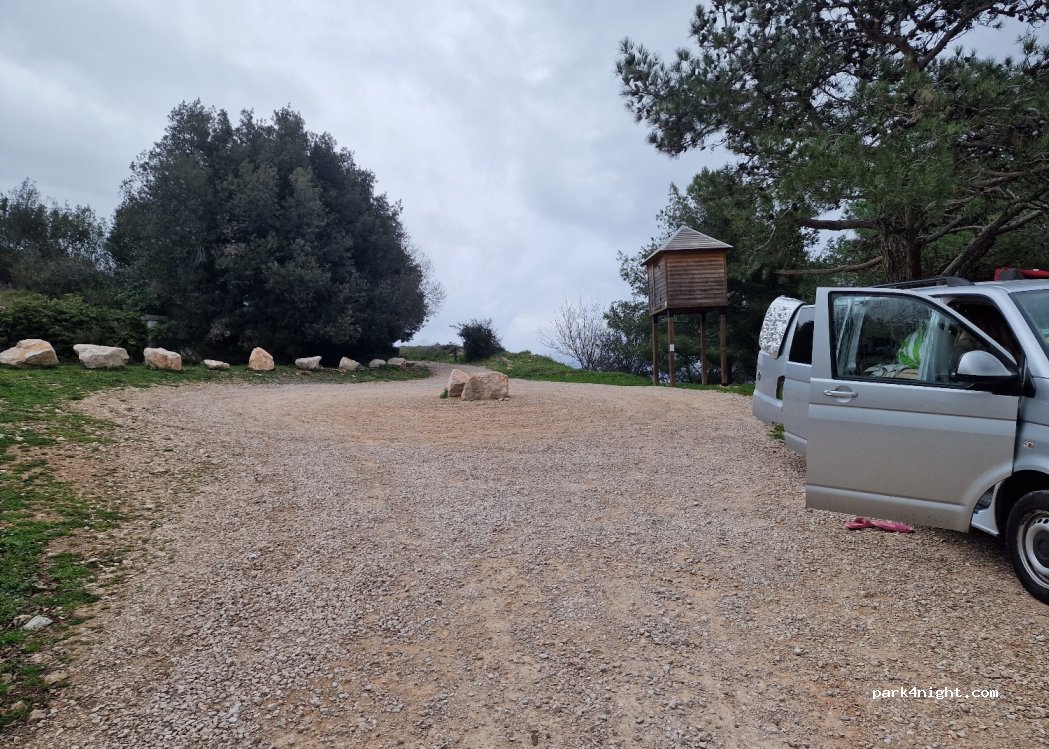 on vient d'installer la voiture pour dormir, le terrain est un peu en pente mais ça va ça passe, il y a environ 6 places de voiture. le coin est paisible, la vue est très belle et on en est satisfait. en novembre il fait plutôt bon