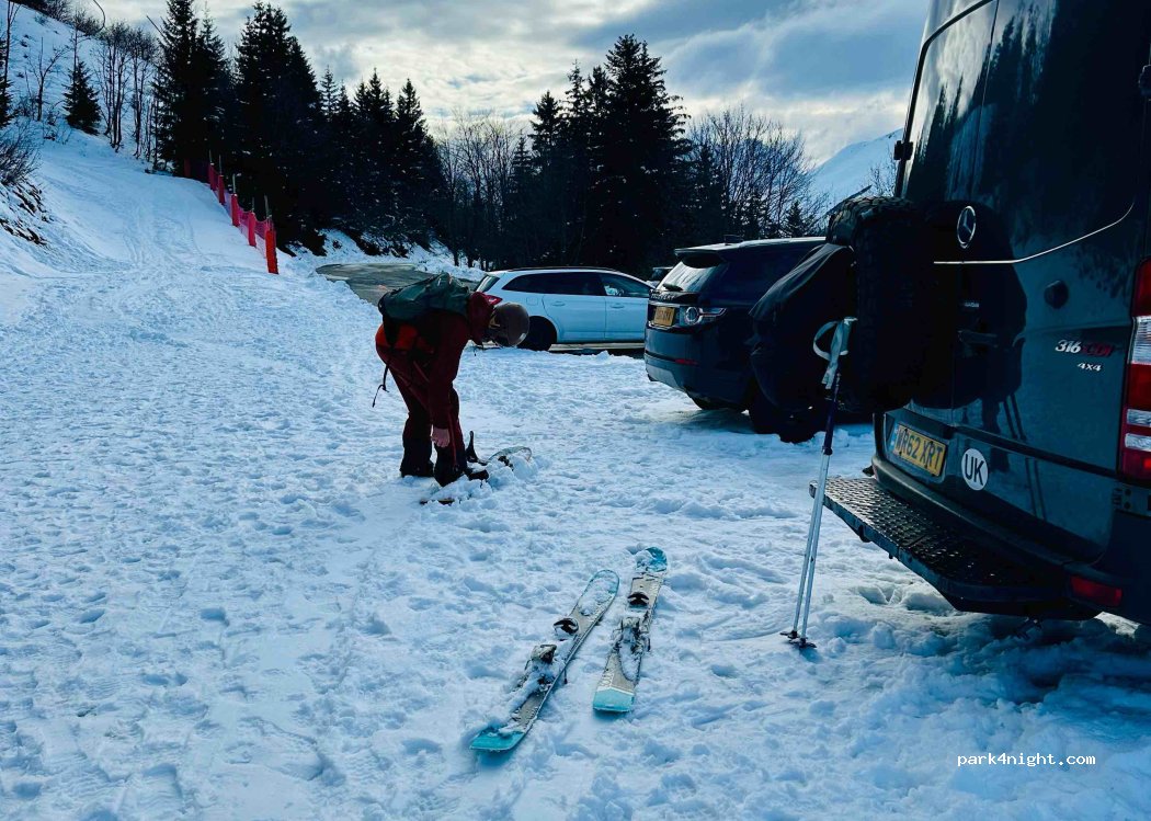 Ski in / ski out location in wooded carpark. Small shop, ski pass office and toilets 250m down the road in the village. Currently no local objections to campervans, however that will only continue to be permissible if we keep the area clean, tidy and park responsibly.