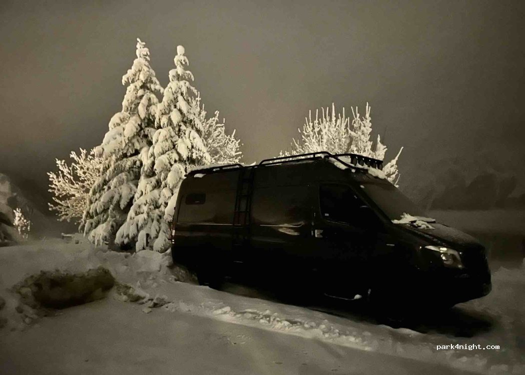 Ski-in/Ski-out-Standort auf einem bewaldeten Parkplatz. Kleiner Laden, Skipassbüro und Toiletten 250m die Straße hinunter im Dorf. Derzeit gibt es vor Ort keine Einwände gegen Wohnmobile, dies ist jedoch weiterhin nur dann zulässig, wenn wir den Bereich sauber und ordentlich halten und verantwortungsbewusst parken.