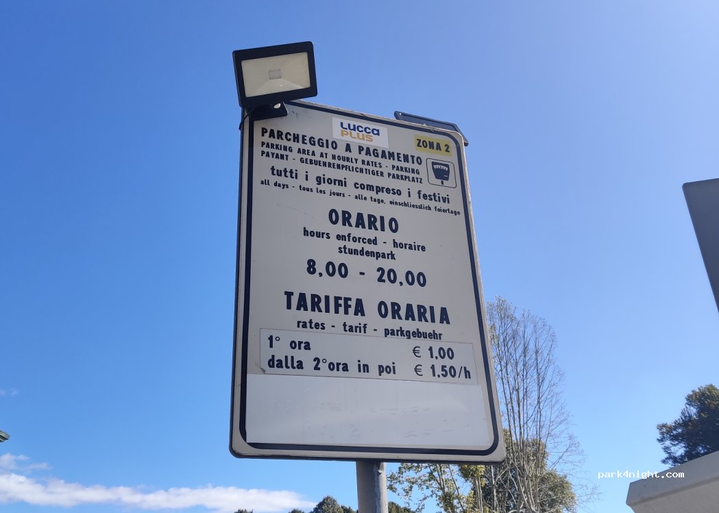 Parking de pago pero justo a la entrada de la preciosa ciudad amurallada de Lucca, con una autocaravana de 7,5 aprovechamos el voladizo en la acera de la parte de atras para poder aparcar en una sola plaza, sin problemas perfecto para visitar la ciudad.