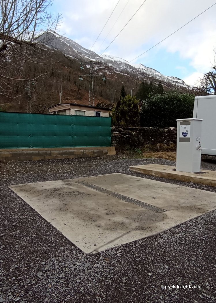 excelente área con parcelas con o sin luz todas muy amplias. Se encuentra casi en el mismo pueblo, muy bonito con un río y excelentes vistas de los Pirineos franceses. Acceso a través de Camping car. Repetiremos.