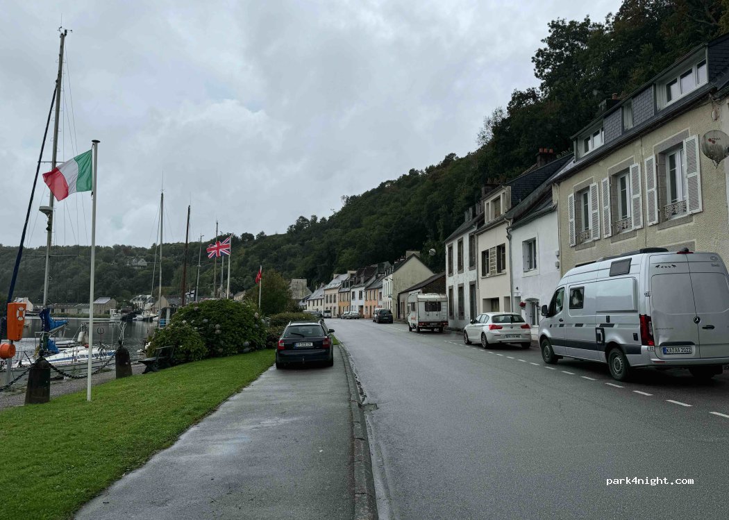 Parking spaces by the Aulne. Small quiet village with pretty houses, pleasure boats, birds sing as in the countryside. Picnic stop with tables. Night possible, but at the exit of the village there is easier with a large parking lot of 7 to 8 places.