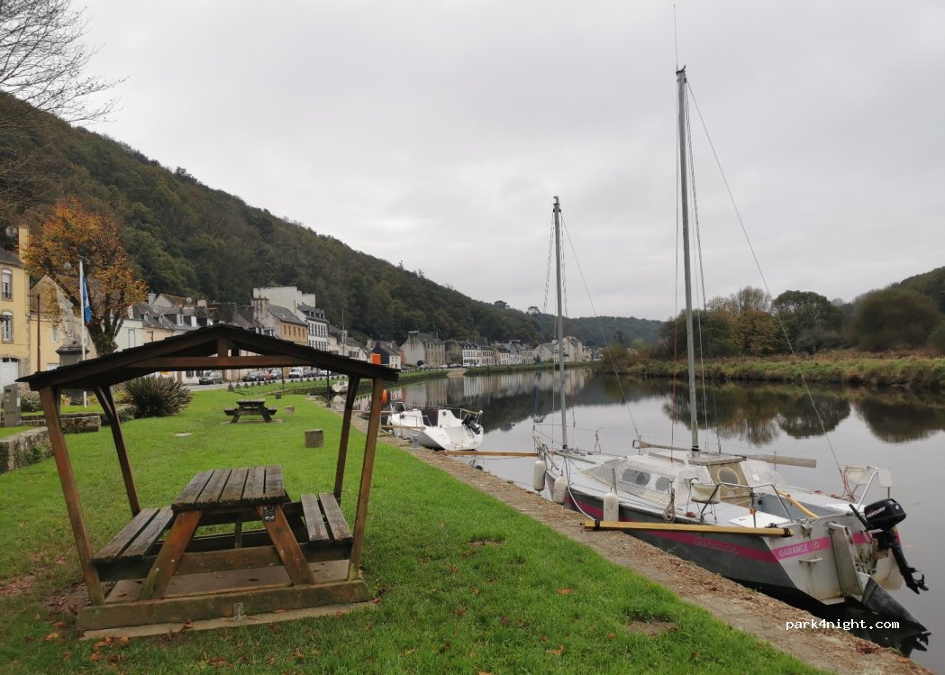 Places de parking en bord de l'Aulne. Petit village calme avec jolies maisons, bateaux de plaisance, les oiseaux chantent comme en pleine campagne. Arrêt pique-nique avec des tables. Nuit possible, mais à la sortie du village il y a plus facile avec un grand parking de 7 à 8 places.