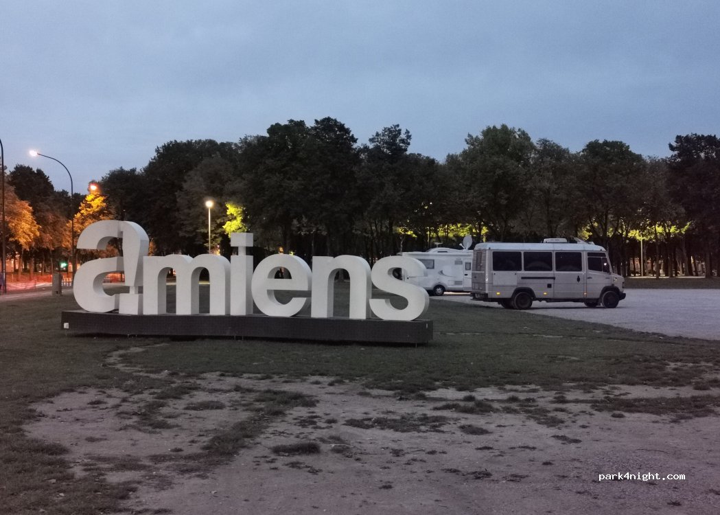 Amiens Zoo's large gravel car park (level but with a few holes) which can accommodate camper vans. We spent one night there and the place is rather quiet. Close to the Hottoie park and the hypodrome.