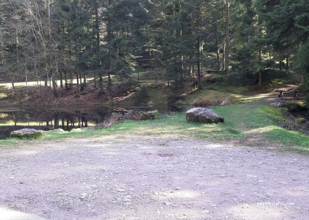 1 place de parking. Bulli tout-terrain ou mini camping-car. en pleine forêt. petit lac. très calme. Eau cristalline au printemps. Bancs à disposition.