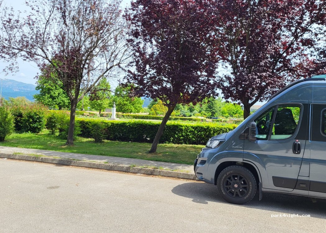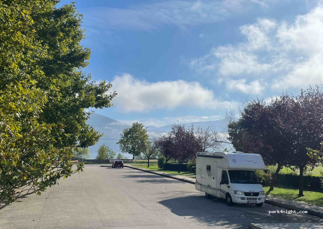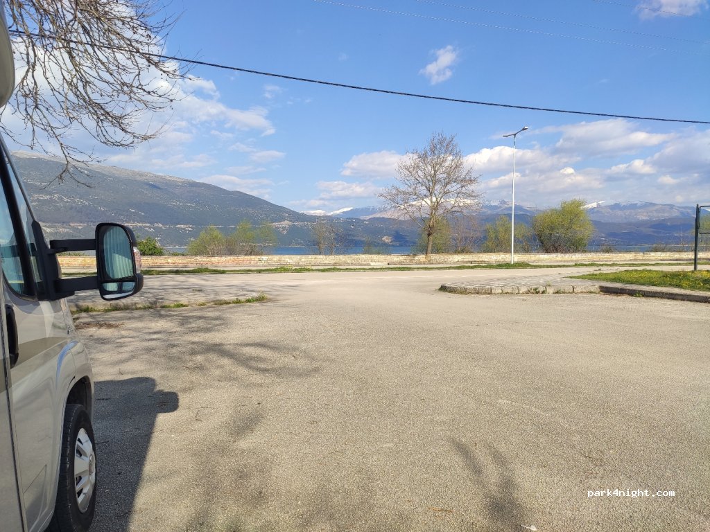 Für die Stadtbesichtigung von Ioannina ein guter Ausgangspunkt. Direkt vor dem Kongresszentrum an einer wenig befahrenen Straße. Also ist das Übernachten auch möglich. 1,6km am See entlang laufen ist sehr entspannend.