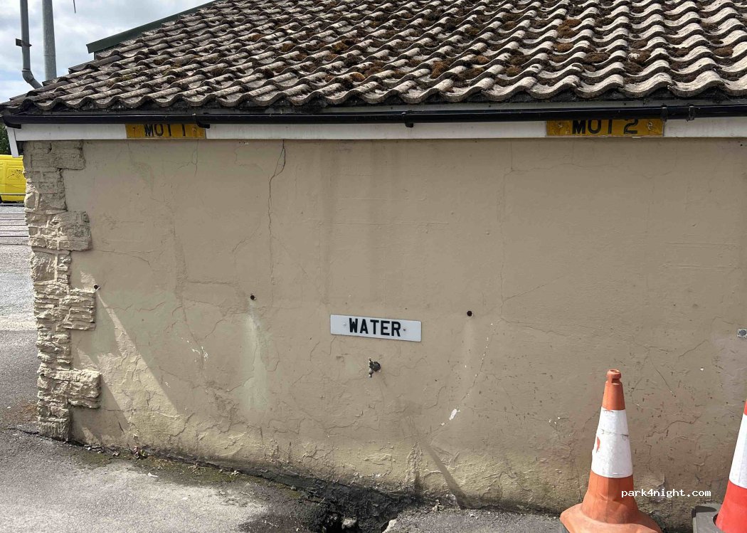 Water tap directly in front of entrance on the wall of the MOT station. Doesn’t have a head though so will need pliers or similar to turn it on. Has a sign above tap saying WATER. Also an air & water machine to side of petrol station.