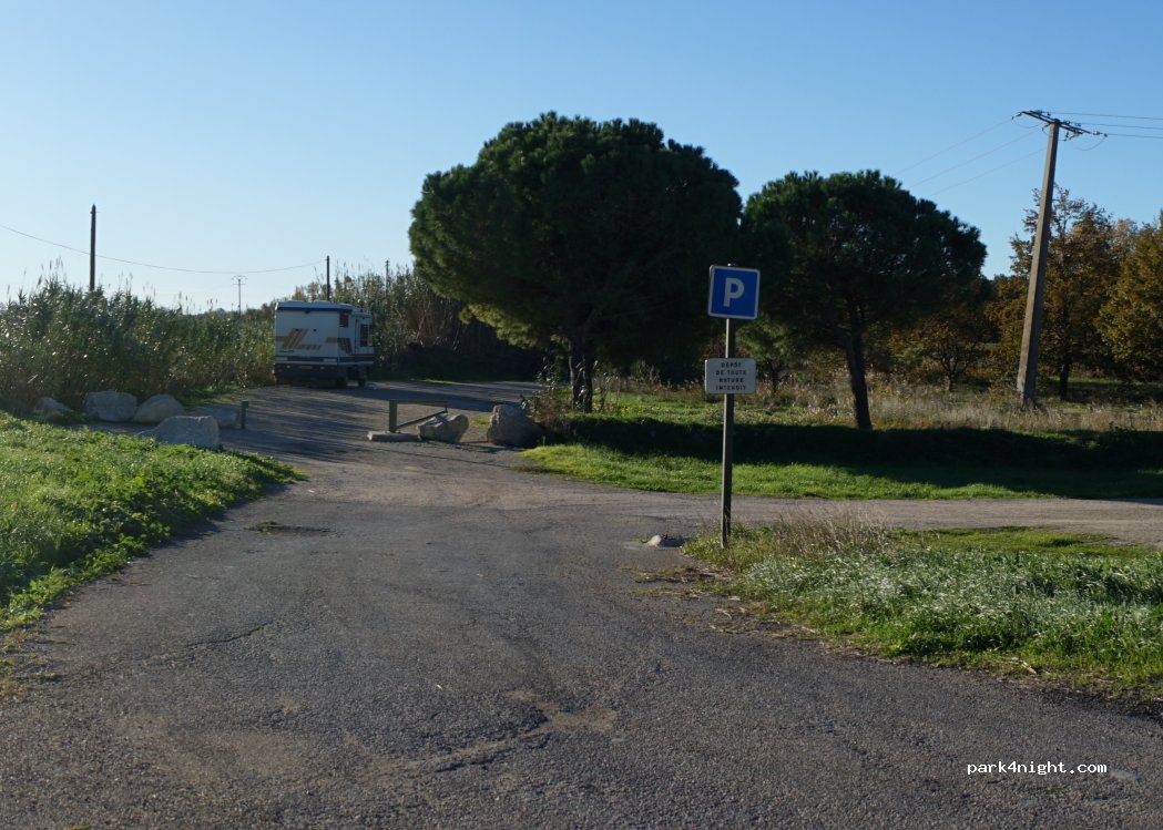 Nuit calme malgré la proximité de la route, peu de passage à cette saison. barrière de hauteur démontée, accès libre et pas d interdiction mais zone de stationnement restreinte par cailloux, zone plane mais sous ou très proche de lignes haute tension. Du vent donc pas de moustiques.