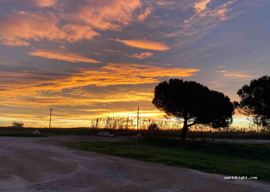 pernocta peculiar, al llegar habia muchos mosquitos, tuvimos que salir encapuchados de la furgoneta y aún asi nos picaron, se oyen detonaciones toda la noche (como si fueran disparos), carretera justo al lado pero con poco tráfico. No hay sombra por la mañana.