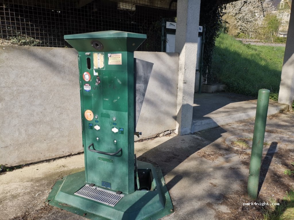 Il n'y a pas l'électricité annoncée, borne ravagée, pas de prises électriques... alors qu'on peut lire sur un autocollant à moitié déchiré : 1 jeton pour 6h... pas plaisant quand on a fait des kilomètres pour trouver de l'électricité...! .mais il y a des poubelles ménagères et verres et on peut vidanger les eaux usées, vider et rincer la cassette WC.