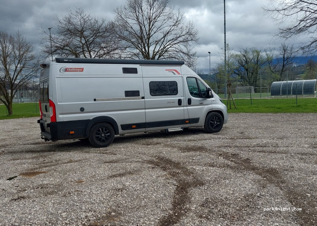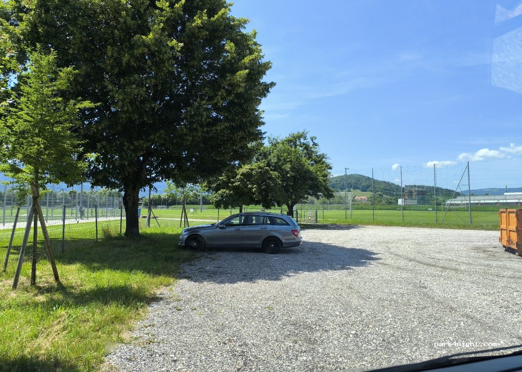 Großer Schotterparkplatz direkt neben den Fußballplätzen.