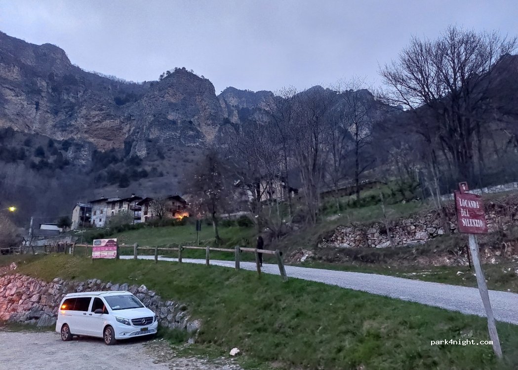 Parking at the entrance to the village (Camoglieres) accessible only for vehicles up to 6 m, narrow road with tight bends. Starting point for via ferrata, crag with climbing routes, excursions. Adjacent to the Locanda del Silenzio (currently closed). Fountain in the village.