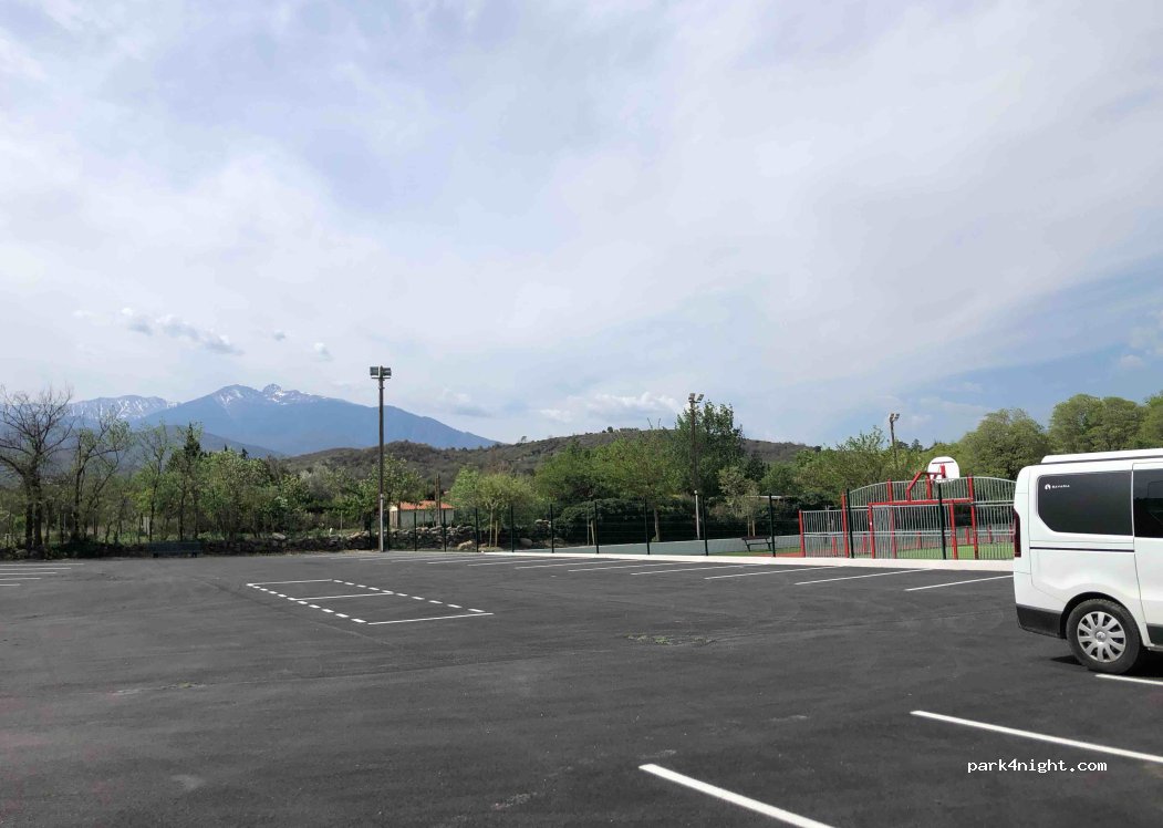 Parking du stade, tout neuf, plan, goudronné. Vue sur le Canigou, calme. Rivière juste à côté. Café associatif sympa à 300 m environ. Boissons, petite restauration.