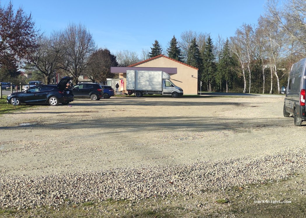 Parking à proximité de la petite supérette, distributeur de pizza, distributeur de pain chaud, laverie automatique, table de picnic, sympa pour faire une halte le midi voir passer la nuit.