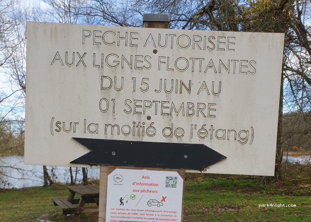 Superbe vue sur l étang pour une nuit au calme! possible de se baigner même si les pêcheurs apprécient peu... rond des pêcheurs bien indiqué en venant du rond gardien tout de suite à gauche après chicane qui vous fait passer la queue de l étang