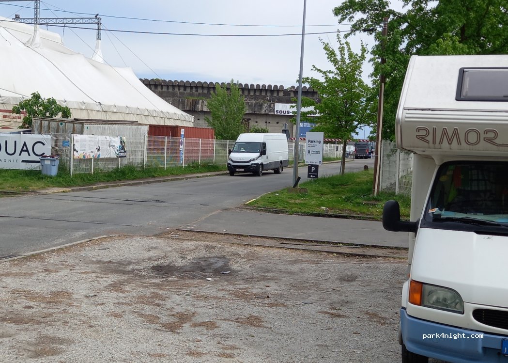 A quelques mètres de l'entrée du bunker sous-marin de la Seconde Guerre mondiale, base BETASOM. Nous avons dormi après avoir demandé aux policiers qui quittaient la base, aujourd'hui musée d'art. Aucune interdiction. Quand nous nous sommes réveillés à côté de nous un petit camping-car anglais. Nuit tranquille. A 3 km du centre.