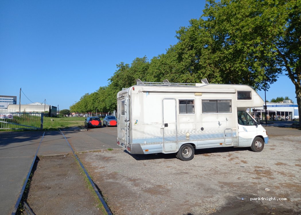 A few meters from the entrance to the WWII submarine bunker, BETASOM base. We slept after asking police officers who were leaving the base, now an art museum. No ban. When we woke up next to us a small English camper van. Quiet night. 3 km from the center.