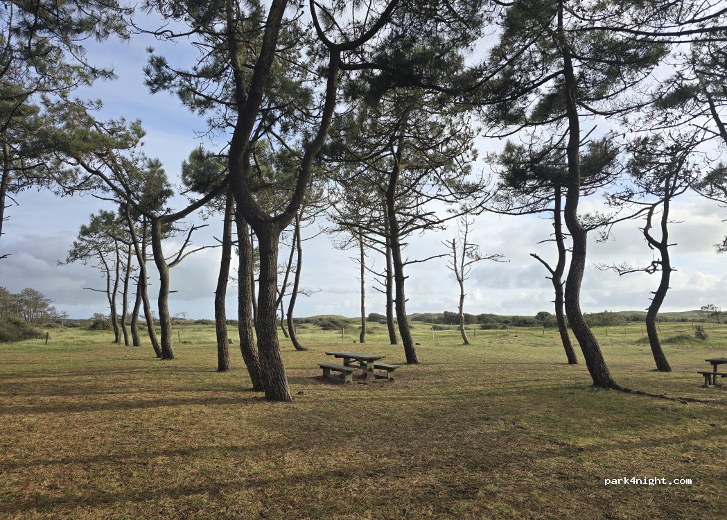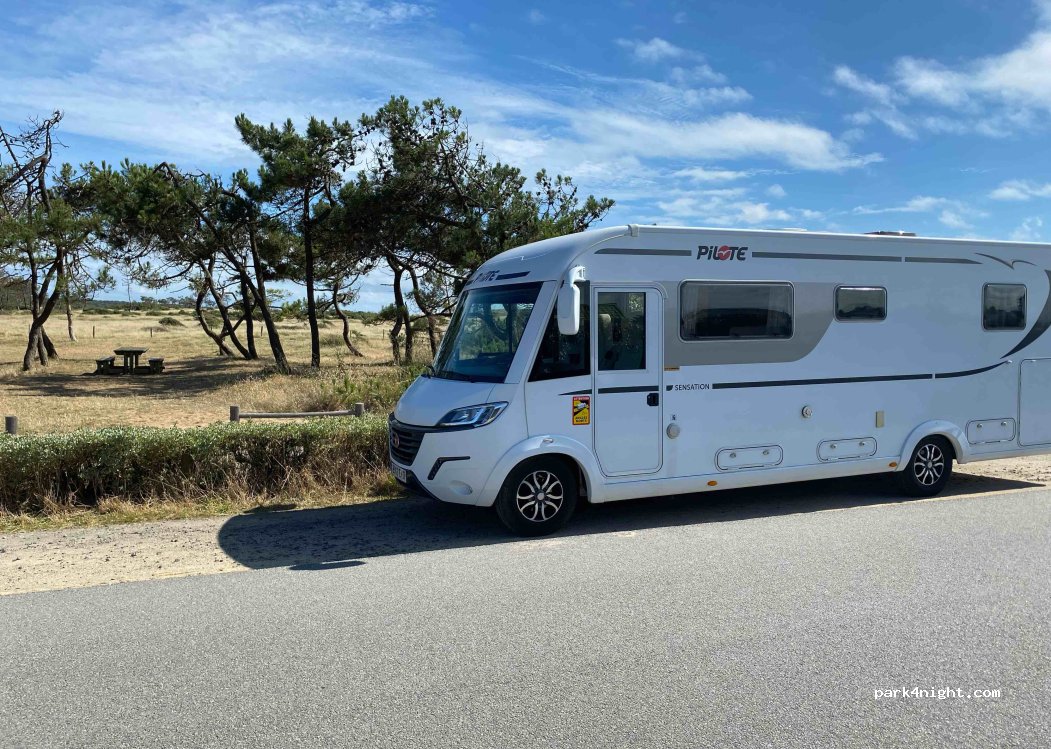 der einzige platz wo keine 2.1 m beschränkung ist und man mit dem womo parken kann. wir haben den parkplatz tagsüber für ein paar stunden benutzt und einen tollen strand- und waldspaziergang gehabt. es gibt keinerlei mistkübel in der gegend. es ist einiges los tagsüber an menschen und hunden. wir waren sehr dankbar für diesen strandnahen parkplatz :)