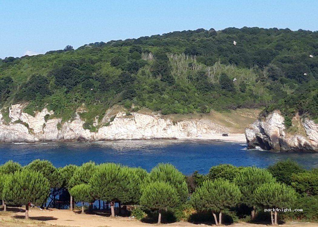 Nice cove, white peable beach, locals only. Stayed on the cliff next to Kilimli Cafe. Super nice and fairly clean (for the Turkish standard). There are functioning toilets but very dirty. Phone reception available. The owner of the bar asked 400 TRY to spend the night