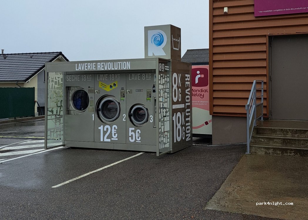 Laverie avec deux machines à laver et une à sécher. À côté du magasin Intermarché.