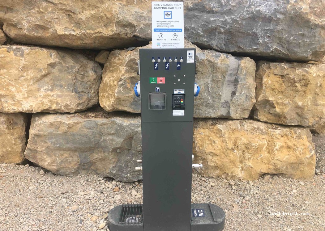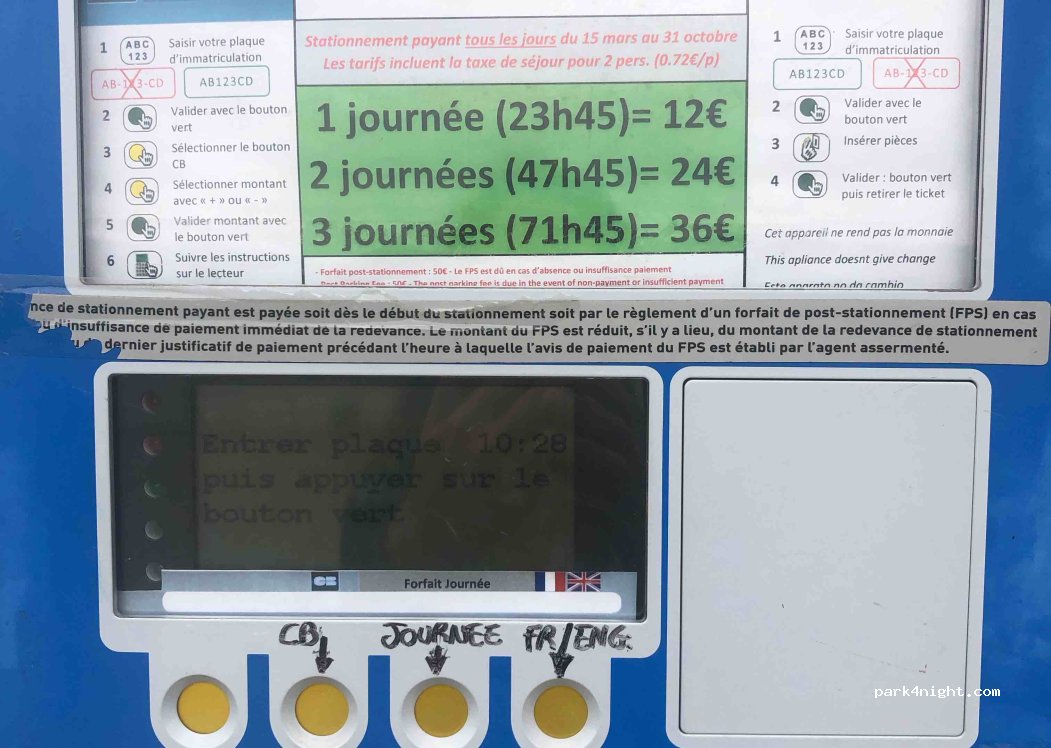 Un parking payant assez baroque où les espaces réservés aux camping cars ne sont pas assez longs…un des deux côtés ne sert donc à rien… Bref… Heureusement, ce n’était pas la cohue…. Sinon, espace toilettes hyper propre juste à proximité et accès rapide au village. Notez bien que l’espace a évolué depuis la photo. Le parking réservé se trouve désormais au fond ou l’on voit les tas de graviers…