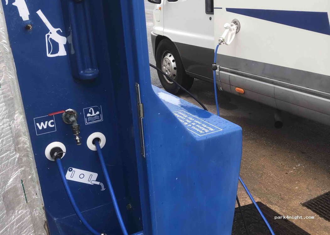 Área de serviço de autoestrada óptima para parar, descansar, descarregar águas sujas e carregar com águas limpas e até electricidade. É necessário ir pedir uma coin dentro da estação de serviço mas é gratuito. A utilização de cada coin tem a duração de 20 minutos mas é óptimo para encher água limpa e carregar um pouco as baterias. Funcionou tudo na perfeição.
