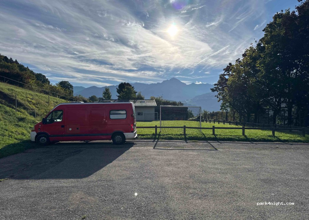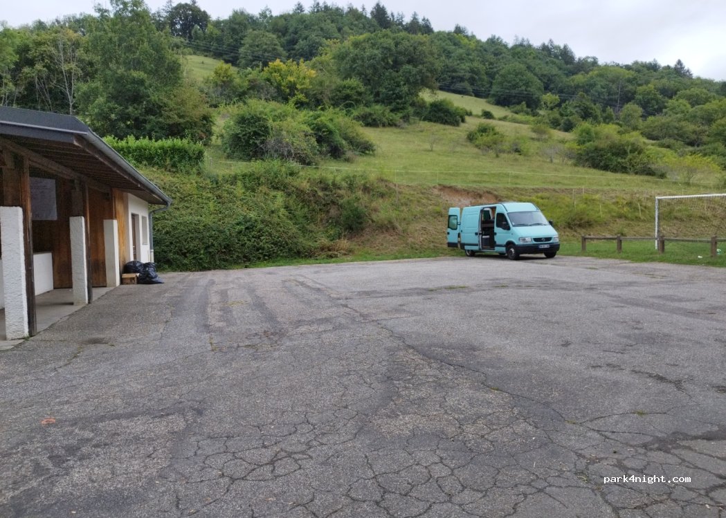 Parking salle polyvalente. Aucun service. Bonne couverture réseau. Terrain de football à côté.